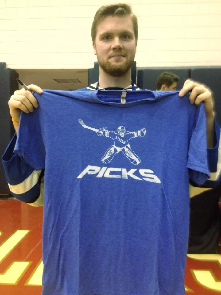 LGW wanted to have her free shirts sent to Picks so that he could have the shirt that he inspired on that fateful night in Colorado where he got his first ever shoot-out win and in the most authentic response to winning ever... struck the "come at me bro" pose that you see on the shirt itself.